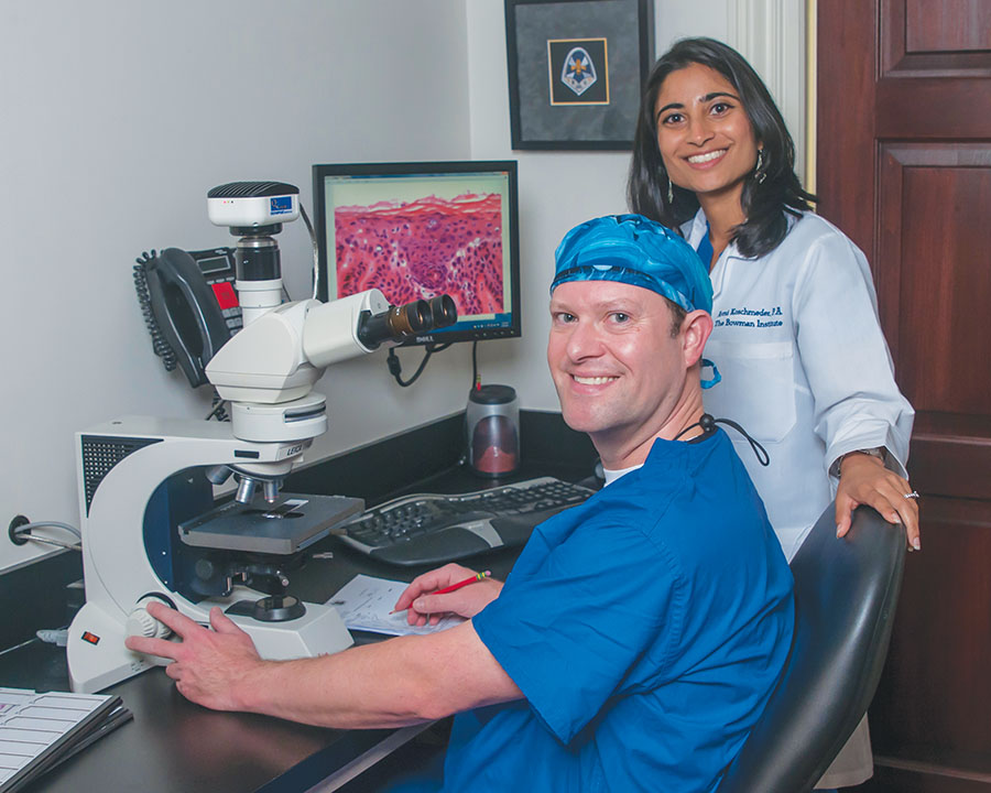 In Mohs surgery, Dr. Bowman is both the surgeon and the pathologist â one of the key definitions of the procedure. He is the one who looks at the tissue under the microscope to determine if, or where, any cancer cells remain, and if they do, he knows exactly where to go back to follow them. âEverything is processed on site, in our own lab,â Dr. Bowman says. âItâs a different standard of processing.â