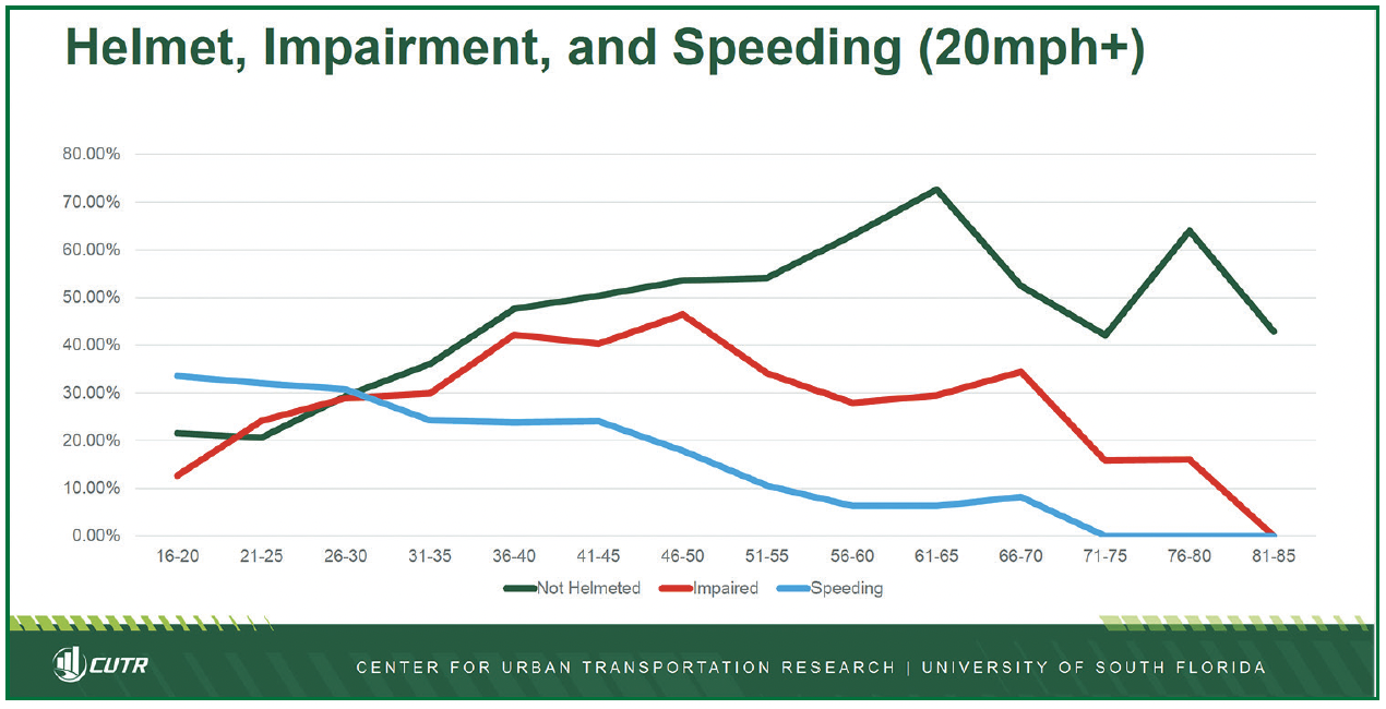 Dr. Lee’s data on the behavioral risk factors — intoxication, lack of helmet use and speeding (graphic below) — in fatal crashes shed light on the risky behavioral patterns certain age groups have. For improper helmet use, riders aged 16-25 have the lowest rate of non-helmet use fatalities, at around 20%. From there, the percentage steadily increases throughout adulthood and peaks with riders aged 61-65 at around 70%. Perhaps somewhat surprisingly, when it comes to impairment fatalities on motorcycles, riders aged 16-20 had the lowest percentage, at roughly 10%. The intoxication fatality rates increase with age and peaks for riders ages 46-50, at more than 40% of the motorcycle fatalities.