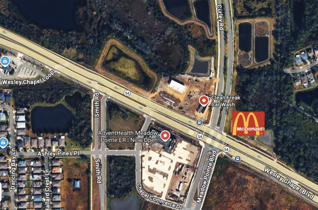 Ironically located across S.R. 54 from the AdventHealth Meadow Pointe Emergency Room at the corner of Curley Rd. (map, left), ground was recently broken on a new freestanding, 3,859-sq.-ft. McDonald’s on a 1.76-acre site (see map and photo) and will have right-in, right-out driveway access to both Curley Rd. and Wesley Chapel Blvd., plus dual ordering boards. It will be the fourth McDonald’s in Wesley Chapel. For more info, visit McDonalds.com.