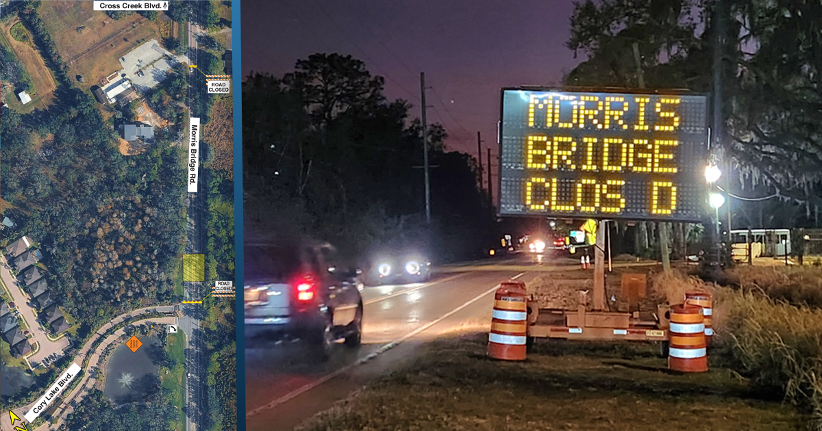 According to electronic message boards already placed along the roadway, Morris Bridge Rd. will be closed from February 16 through Monday, February 23, to allow crews to replace an under-road culvert immediately north of Cory Lake Blvd. The culvert currently is covered by steel plates.