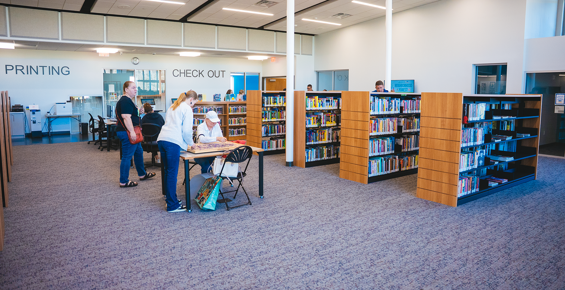 In addition to books, magazines and the “Library of Things” — a collection of non-traditional, check-outable items, including adaptive toys, Wi-Fi hotspots, ukuleles, bird-watching kits and board games designed for enrichment and exploration — the library also features public computers, printers, collaborative spaces, a gallery wall in the lobby, an outdoor event lawn and a multi-purpose room for makerspace and other activities.