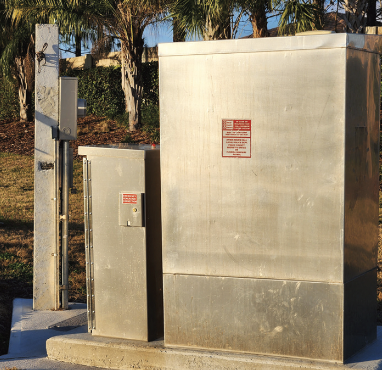 You’ll often see a power meter beside the cabinet, just like on a home. Smaller attached (or standalone) cabinets typically house battery backup systems (UPS units), which can place signals into flash mode during power outages.