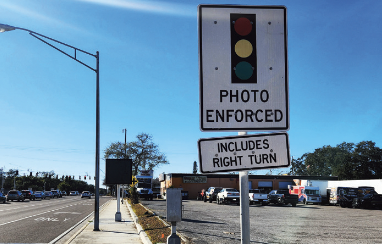 In Florida, red light cameras (left photo) must be clearly identified by a roadside sign stating “Photo Enforced” (right photo below) in advance of the intersection.