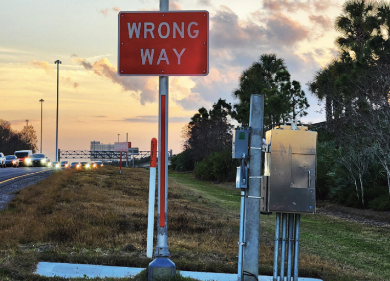 Wrong-way driving prevention used to rely solely on static “Wrong Way” and “Do Not Enter” signs. Today, it’s some of the most advanced roadway technology in use. Modern systems use radar, video, or both (photo right) to detect vehicles entering exit ramps in the wrong direction. When activated, the sign perimeter flashes red lights, and alerts are automatically sent to law enforcement — including the Florida Highway Patrol.