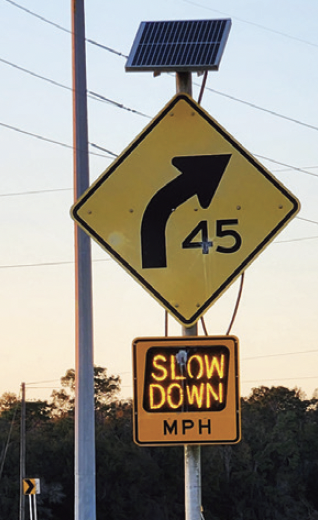 These radar-based warning signs detect the speed of approaching vehicles and display it back to the driver. If you exceed the desired speed, the sign may flash your speed. At higher thresholds, it may flash “Slow Down” more aggressively (left).