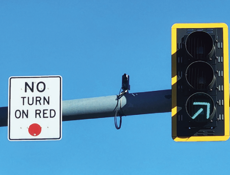 These cameras (right) are becoming increasingly common as older loop systems (below) are phased out. Unlike older directional cameras, these units look down over an entire intersection with a wide field of view.