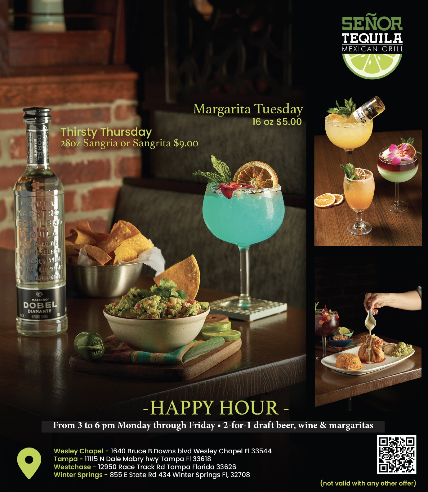 Señor Tequila is located at 1640 Bruce B. Downs Blvd. It is open Mon.-Thur., 11 a.m.-10 p.m., 11 a.m.-11 p.m. on Fri. & Sat. & 11 a.m.-9 p.m. on Sun. For more info, call (813) 428-5411, visit TheSenorTequila.com.Â