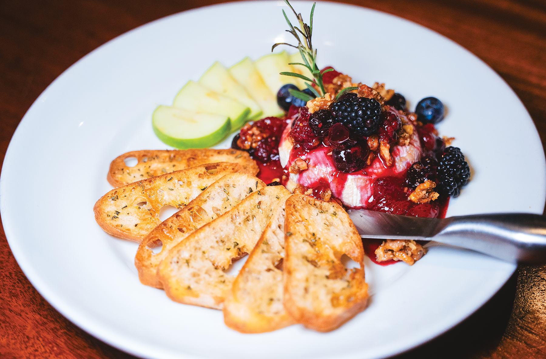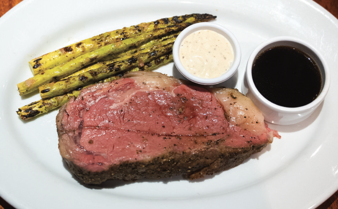 To the right is the delicious new baked brie with a raspberry glaze, fresh fruit and nuts served with crispy toasted bread. And of course, Stonewood serves some of the best prime rib (above, right) among its #1-rated steaks..