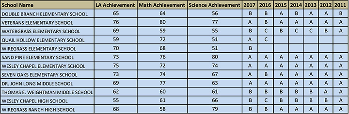 Both of Wesley Chapel’s middle schools earned As, while its combined middle/high school, Cypress Creek, received a B. Wiregrass Ranch High received an A, while Wesley Chapel High received an B. (See chart)