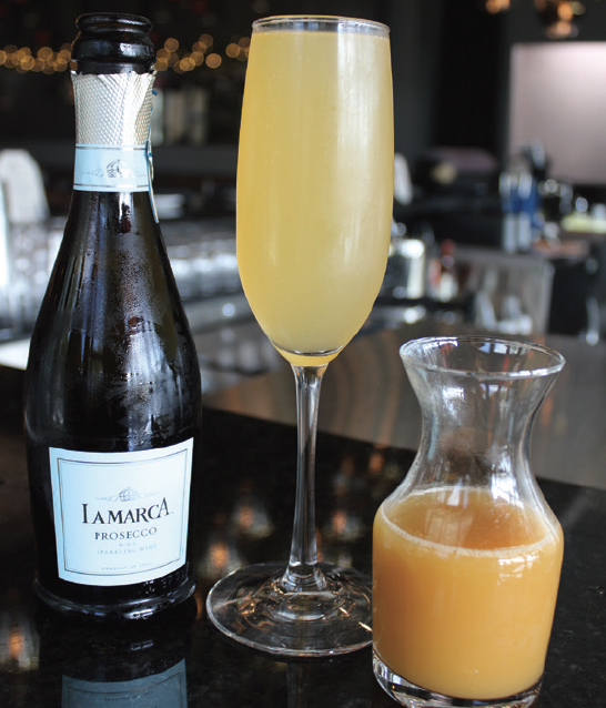 Our “Warmup” started with a beef-&-cheese empanada (left), which was extra-crispy and served with a creamy garlic aioli dipping sauce. Chef Soto says he will vary the “surprise” filling of the empanadas every week. Jannah also appreciated the way Tallo does its “Mamita’s Mimosas” — providing a 375-ml (or half) bottle of her favorite La Marca prosecco with your choice of two delicious juices — orange, peach, cranberry, pineapple or mango. Jannah only chose the peach (below right) and savored every sip.
