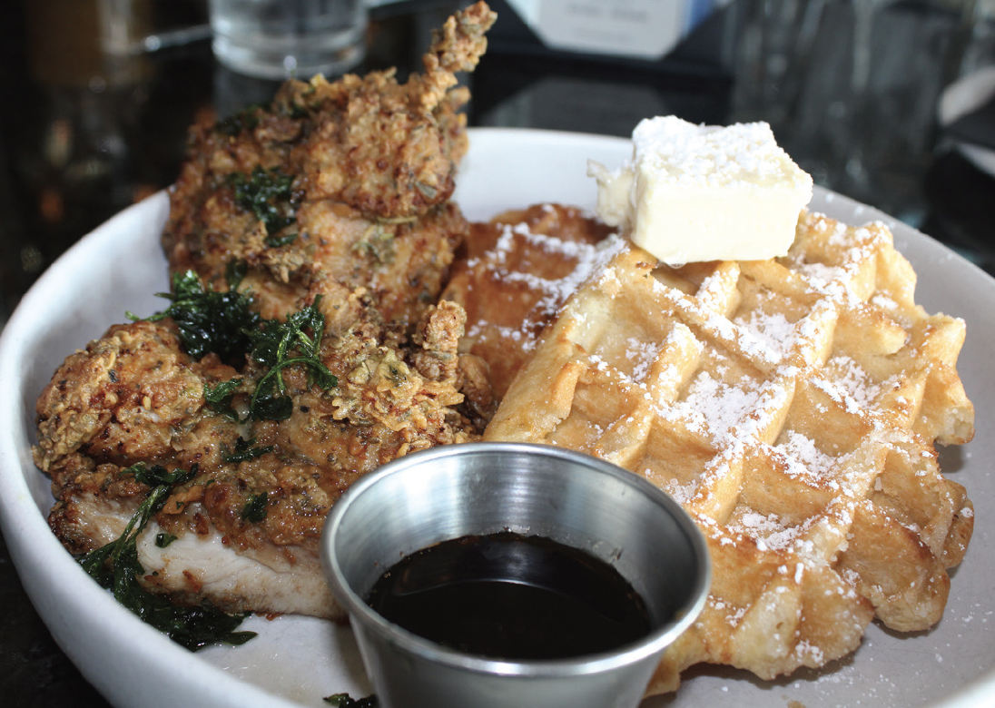 Meanwhile, I absolutely loved the super-crispy, deliciously different fried chicken & sugar waffles I ordered. The two big waffles were topped with powdered sugar and butter (although I didn’t really need either one) and served with a side of bourbon maple syrup — the syrup was a game-changer for yours truly. The fried chicken on the bone isn’t typical of other places. Instead, it has a Caribbean-spiced twist that I totally ate up! (Pun intended? Maybe!)