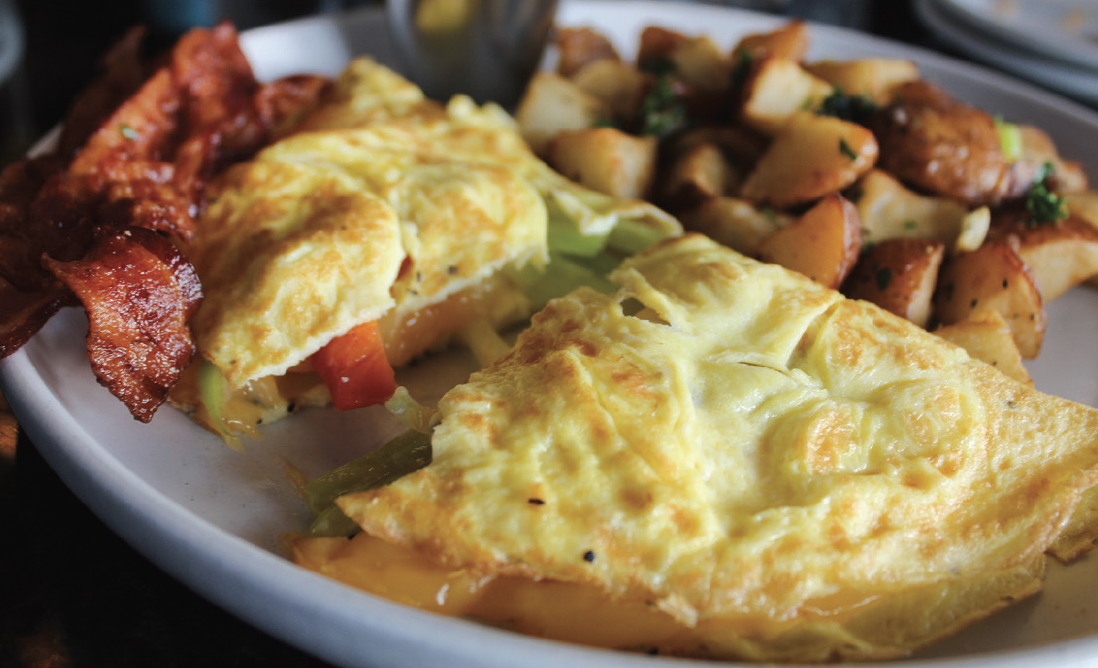 For our brunch mains, my wife picked Tallo’s omelette, which was overstuffed with arugula, green and red peppers, onions and smoked gouda cheese and served with well-seasoned breakfast potatoes. We added the side of crispy bacon shown in the bottom left photo.
