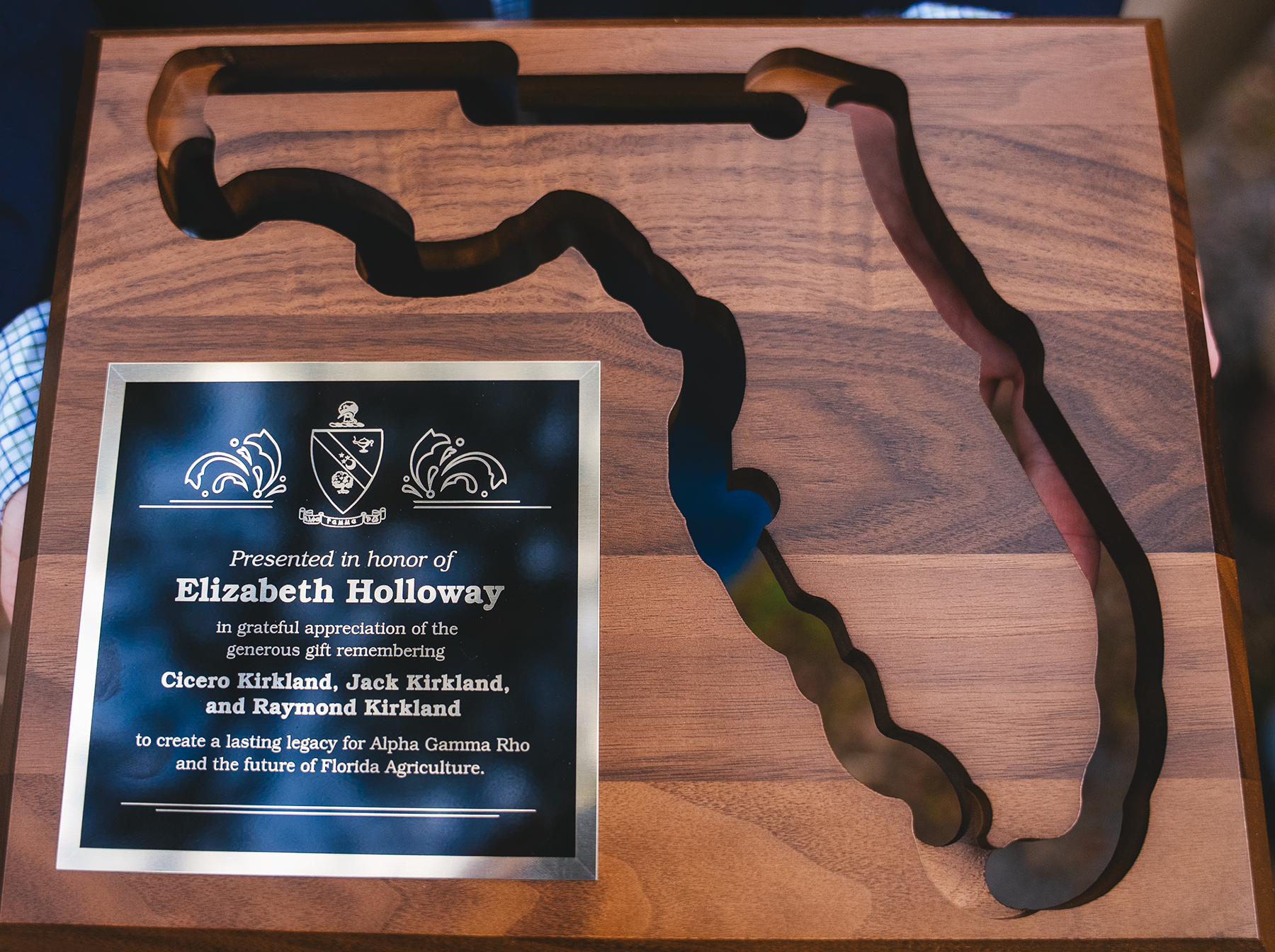 At any rate, on hand for the check presentation were (l.-r. in the top photo) Alpha Gamma Foundation pres. Steven Hall, Kirkland family & Holloway Foundation trustees Caesar Rinalvi and Bob Sharp, Dist. 54 State Rep. Randy Maggard, Spalten and Comm. Simpson. At right is a photo of Elizabeth “Betsy” Holloway and far right is the plaque presented in her honor to Rinalvi and Sharp by AGR, “in grateful appreciation of the generous gift remembering (Betsy’s father) Cicero, Jack & Raymond Kirkland (Betsy’s brothers) to create a lasting legacy for Alpha Gamma Rho and the future of Florida Agriculture.”
