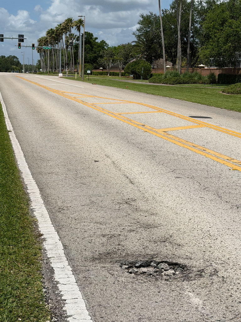 New Tampa Blvd. Repaving — The funds allocated for this item were approved by Council months ago, and construction was expected to begin by sometime this month, but has been delayed until June or July of this year. In the meantime, almost all of the existing potholes on the 1.8-mile stretch of New Tampa Blvd. were recently filled in prior to the repaving (at left is one pothole that hadn’t been filled in at our press time).