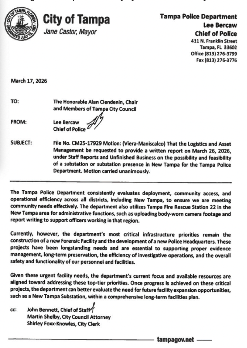 New Tampa Police Substation — Viera, who has been fighting for months for a TPD substation somewhere in New Tampa, said during the Apt. 7 City Council meeting that he “rejected” the memo he and the other City Council members received from Tampa Police Chief Lee Bercaw on Mar. 17 (right) that said, “Currently, however, the department’s most critical infrastructure priorities remain the construction of a new Forensic Facility and the development of a new Police Headquarters…Once progress is achieved on these critical projects, the department can better evaluate the need for future facility expansion opportunities, such as a New Tampa Substation, within a comprehensive long-term facilities plan.”